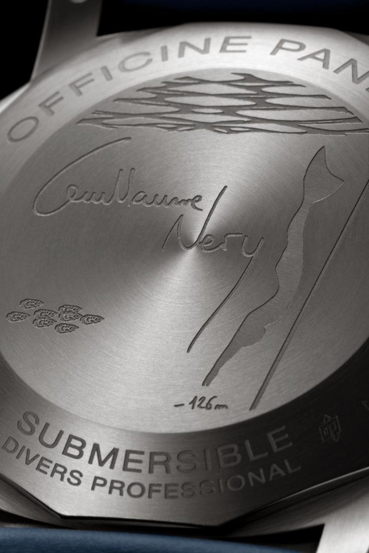 表款採用的是实底盖,虽然无缘看见P.9100机芯的风采,但有失必有得,底盖上刻印了Guillaume Néry的侧身剪影、签名字样以及他所创下126m的数据纪录,充满个人化色彩的设计增添了PAM00982的独特性与收藏意义,至于P.9100机芯不仅具有计时功能,它的动力储存也达到3日链标准,足以应付日常佩戴需求。