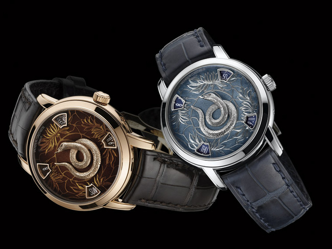 江诗丹顿此次选择中国十二生肖做为艺术大师系列的全新主题表款,首推表款为紧接而来的「蛇年」。透过品牌制表大师深厚大明火珐琅与金雕两项技艺,打造出充满诱惑性、姿态优雅的蛇形图腾,一共推出铂金与18K玫瑰金两款,每款限量12只,表背皆鐫刻"2013"字样,极富收藏性。
