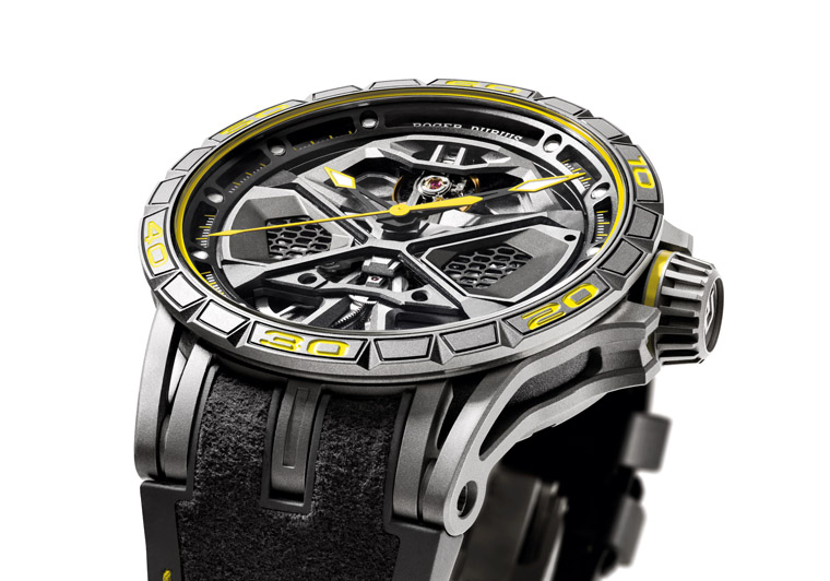 ROGER DUBUIS罗杰杜彼的Excalibur系列过去一年多来顺利和LAMBORGHINI和PIRELLI等车界品牌联名,把原本镂空复杂工艺结合更多和赛车、超跑相关的元素,打造出非常具有特色的高端时计,这两个系列的联名款式走的都是超限量的策略,加上品牌又常常以高科技材质或贵金属材质制表,所以即使要价不菲,市场上排队等着入手的准表主倒也不在少数。随着联名的默契愈来愈浓,罗杰杜彼2019年又即将和LAMBORGHINI联手发表新一代的腕表作品,继Excalibur Aventador S之后,这次双方要推出的新款名为Excalibur Huracán Performante。