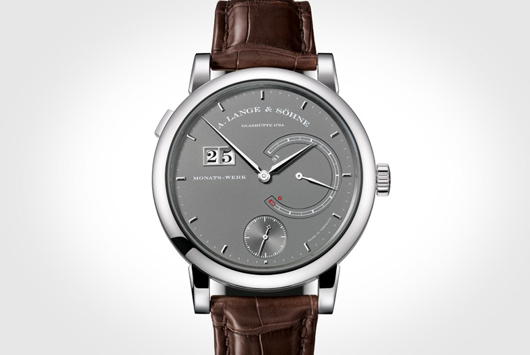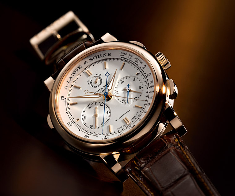 Double Split是全球首枚真正双追针计时腕表,突破追针计时码表的60秒计时局限。腕表有两根追针指针:一根追秒指针,一根追分指针,而且两根计时和追针指针皆具备飞返功能,这是有史以来首款可以进行长达30分钟分段比较计时的腕表。朗格特别研制一个专利脱离齿合装置,计时的时候,追针扫式秒针会停止转动,而计时扫式秒针仍然继续走动,并不会影响腕表的震摆。Double Split配备L001.1手动机芯,是第一枚率先透过黑色实心银两层式表盘显示小时和分钟的腕表,秒钟由左边的银色小表盘显示,而动力储存指示盘则设在罗马数字XII下方。小秒针盘、右边的银色30分钟积分盘,以及动力储存指示盘,在面盘上形成一个等边三角形,这正是朗格表盘的典型构图。