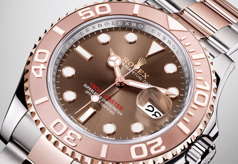 以往的游艇系列曾推出18K黄金、不锈钢及黄金、白金或永恒玫瑰金结合的铂金钢材质等等。2015年则推出破例採用18K永恆玫瑰金表壳及雾黑色Cerachrom表圈,搭配运动风浓厚的橡胶表带,呈现出不同于以往的视觉观感及佩戴感受。这款则是劳力士在隔年的新点子,将Yacht-Master 40变身为文质彬彬的绅士,表壳以永恆玫瑰金钢材质制成,表圈与链带的中间链节为18K永恆玫瑰金,中层表壳、表冠及链带的两侧链节则使用904L不锈钢。