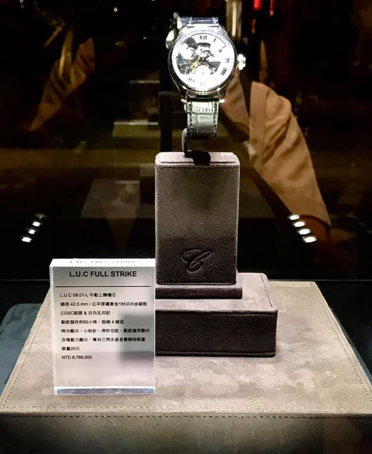 ▲L.U.C Full Strike三问表的相关资讯都在展示柜中的简介写明了。