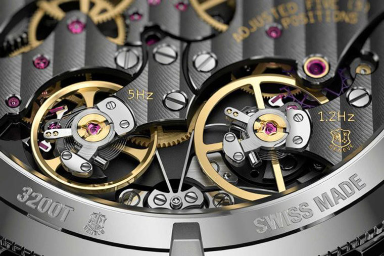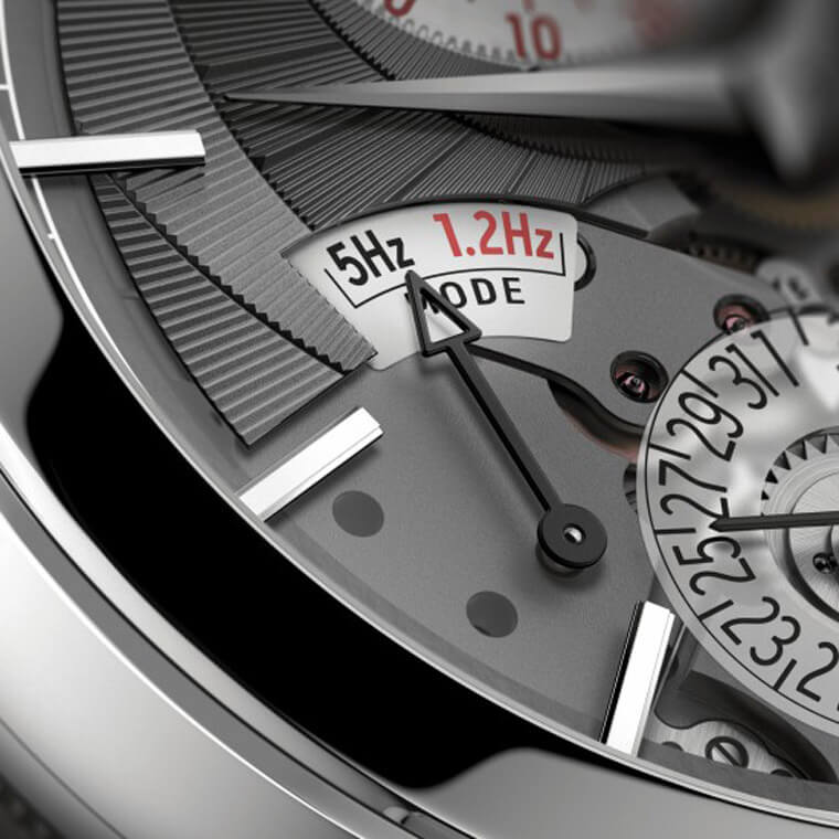 佩戴者可以透过表壳8点方向的按把自由切换摆轮震频,分别为一般状态的5赫兹(36,000次/小时),以及另一种所谓的「待机模式」1.2赫兹(8,640次/小时),有点出人意料的是,两枚摆轮其实只靠同一枚发条盒提供动能,江诗丹顿特别开发出名为3610的手动机芯,它在结构上具备两枚摆轮,但它们并不会同时运作,只有当切换按把启动时,透过齿论上和发条盒的两枚差速器来让两枚摆轮可以互相切换,由于待机模式的慢速摆轮灵敏度较高,因此它的游丝也必须经过重新设计,它的横切面面积只有0.0774×0.0159mm,几乎是另一枚5Hz摆轮游丝的1/4那麼细,这也让不同频率的摆轮系统得以和谐共处,甚至能彼此合作无间。