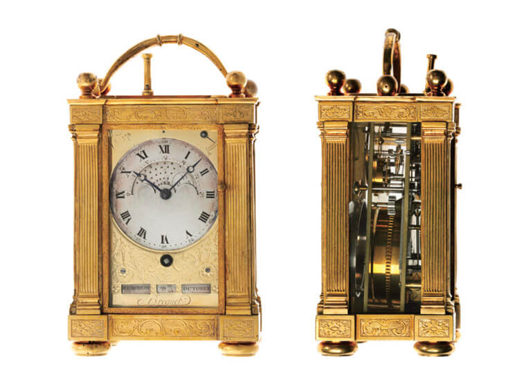 18~19世纪宝璣(BREGUET)凭着多项钟表发明及细致的工艺,因而备受欧洲皇室的青睞,例如拿破仑在出征埃及前曾专程走访宝璣表厂并买下数件宝璣时计,其中四面釉饰的N°178旅行钟,是宝璣于1796年发明的超卓时计,它带有日期显示、报时功能并配备八日动力储存机芯,对于这位当时驰骋于战场上的拿破仑而言,宝璣制作的这款结实耐用、性能可靠又方便携带的旅行钟正好符合他的需求。