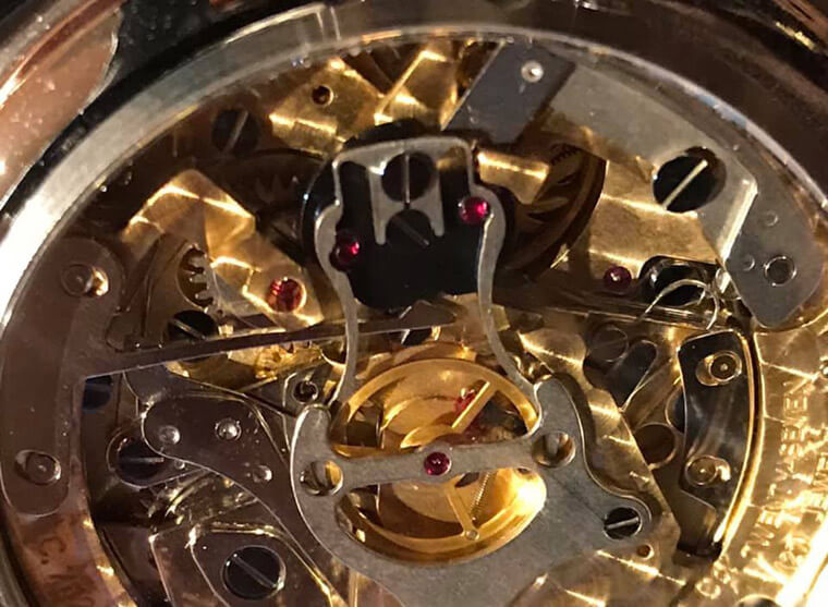 ▲此为IWC独门的螃蟹脚装置,机芯就是靠它来控制两枚计时秒针。
