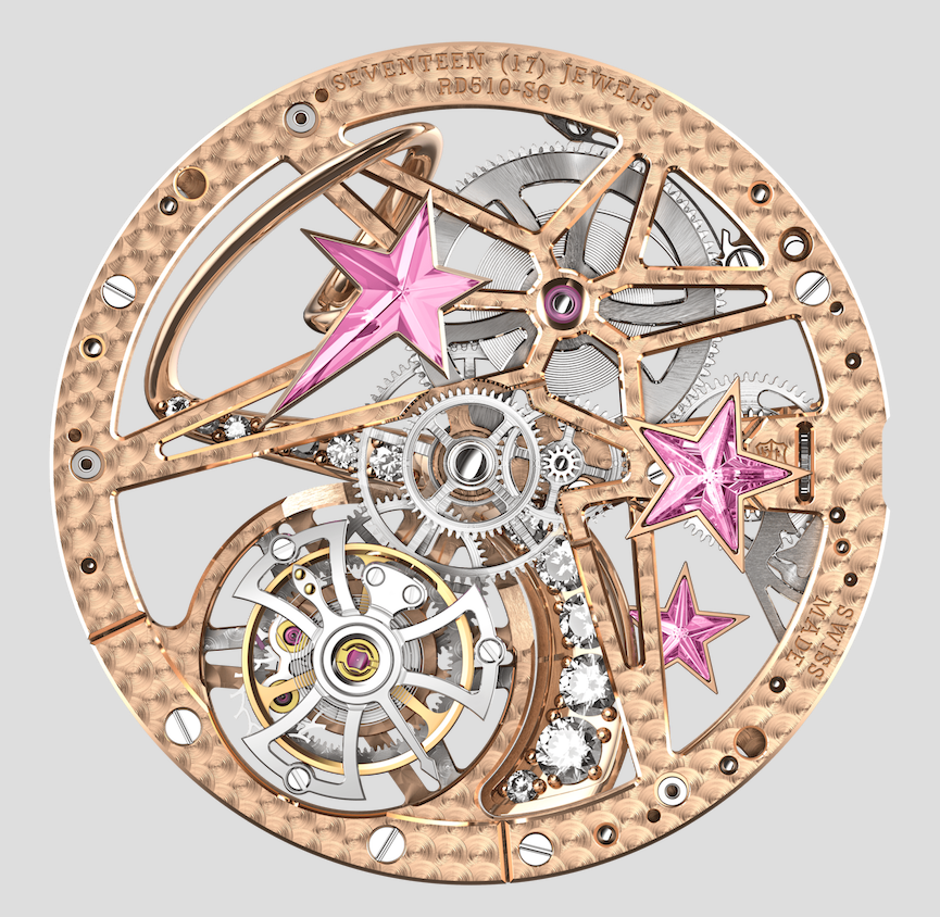 腕表搭载RD510SQ镂空飞行陀飞轮机械机芯,并鐫刻着享誉盛名的日内瓦印记,为镂空复杂功能领域划出崭新的银河大道。镶嵌着圆形切割白色钻石和珐琅装饰元素,并提供粉红色与蓝色两种的版本。蓝色表款配备了钻石镶嵌表耳与表壳,机芯内部搭配精致的蓝色太阳纹装饰。