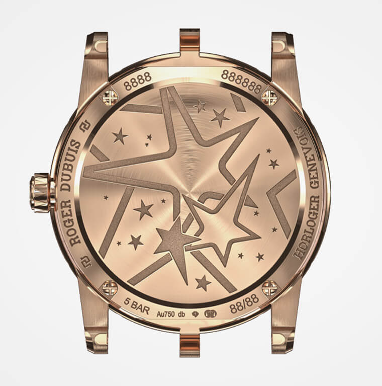 表款除了表圈镶满钻石,面盘上同样在时标环部分镶上钻石作为时标之用,另外在陀飞轮框架附近也有钻石镶饰,耀眼光芒伴随陀飞轮的自转显得更璀璨夺目。罗杰杜彼的腕表创作常与星辰概念联系,在这款Excalibur Shooting Star上更是被发挥得淋漓尽致,品牌在机芯部分的星形框架中填入粉红色或蓝色珐琅,立体造型让星形框架更逼真动人,而罗杰杜彼过往擅长的镂空工艺在这款身上新添了白色珍珠母贝夹板做为装饰,虽然少了穿透的视觉效果,但是珍珠母贝散发出的幻变光芒,搭配星形珐琅以及钻石彼此辉映,令腕表的视觉效果不减反增。