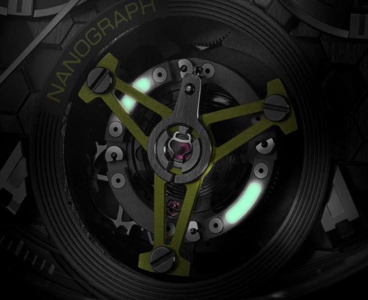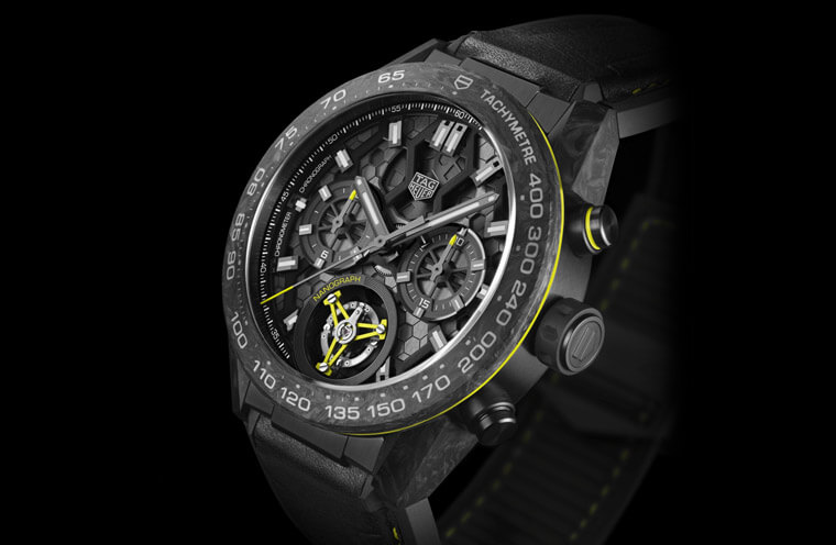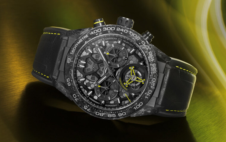 这款Carrera Heuer 02T陀飞轮计时表首创採用碳纤维复合材质游丝与铝合金摆轮 ,有利于游丝完美的同心圆收缩,提高走时精准,经C.O.S.C.认证,精准耐操。经过瞬间加速达5000g的冲击(相当于一公尺高处落地至坚硬表面),金属游丝变形,硅游丝断裂,碳纤维复合材质游丝则完好无损。
