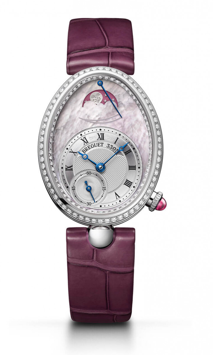 这款全新Reine de Naples那不勒斯王后系列8905情人节限量特别款,表款以18K白金制成,面盘装饰具有迷幻光泽感的粉红色珍珠母贝。12点方向设有宝璣着名的人脸月相,就连月相盘底色也因应情人节主题改换成桃红色。此外8905的表冠上亦镶有粉红色蓝宝石,搭配紫红色鱷鱼皮表带,赋予整体一致和谐的色调。