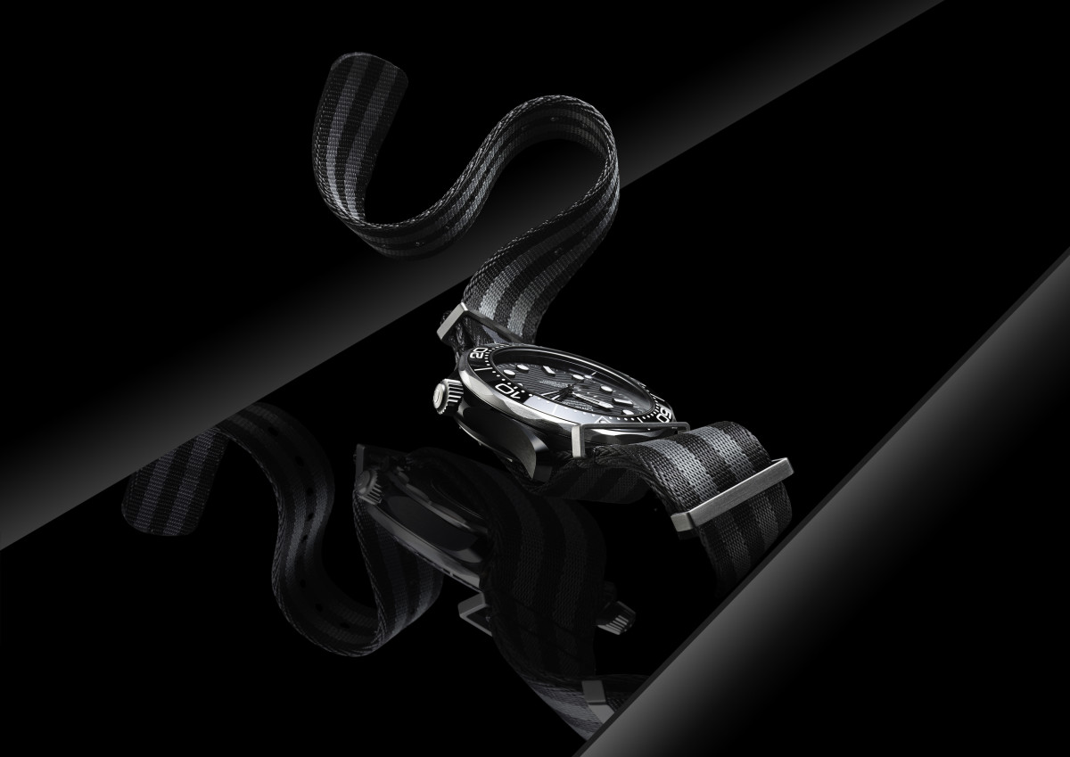 腕表表带可选择搭配黑色橡胶表带或是黑灰相间条纹NATO表带。