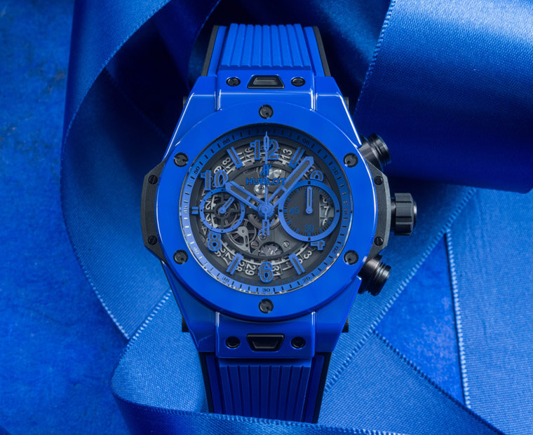 Big Bang蓝色蓝宝石陀飞轮五日链腕表以透明的蓝色蓝宝石打造腕表外壳,就连陀飞轮框架也同样以蓝宝石材质制成,因此从外部的表壳到面盘都呈现出强烈的透视效果,表款搭载的HUB6016手上链机芯除了达到陀飞轮的复杂功能等级,它的动力储存也有五日之多,不仅视觉效果抢眼,性能方面也展现出优质高级制表的水准。Big Bang Unico魔力蓝陶瓷计时码表顾名思义是使用蓝色的陶瓷材质打造表壳与表圈等外部元素,近年宇舶研发彩色陶瓷也非常有心得,除了基本款的黑色陶瓷,包括红色陶瓷以及这款的蓝色陶瓷除了具备抗刮耐磨特性,视觉的吸引力也愈来愈强大(同时红陶瓷、蓝陶瓷的制作难度也高于传统的黑陶瓷,证明品牌在技术上已经更上层楼)。