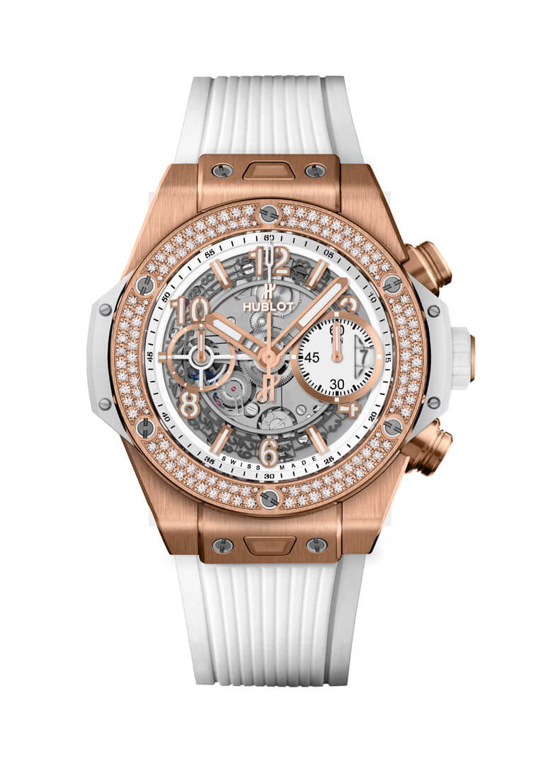 皇金材质/HUB1280 UNICO自动上链机芯/时、分、小秒、日期显示/计时码表功能/表圈镶钻/蓝宝石水晶镜面/防水100米/表径42mm/参考价:NT$ 1,142,000