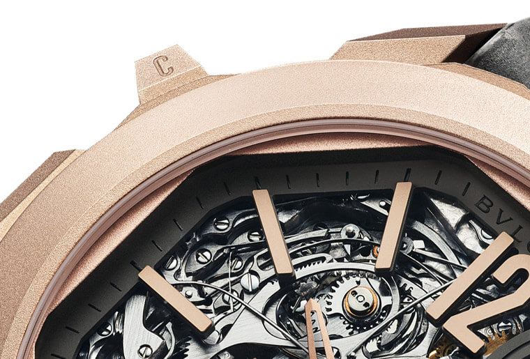 Octo Grande Sonnerie大自鸣腕表採用玫瑰金材质制成,表径44mm以它的复杂度而言并不算特别大,此外宝格丽还在Octo多切面的表壳外观上导入喷砂处理,不管是看起来或摸起来的质感都与一般的拋光处理有所区隔。表款採用开面设计,从手表正面望去就会看到密密麻麻的机械零件组合,佩戴者可以在面盘上看到时、分以及1点方向的报时功能动力储存显示与5点方向的走时动力储存显示,有别于问表常见以拨桿启动,这只表就像去年那款Octo Grande Sonnerie万年历陀飞轮钟乐报时大自鸣一样是以按把启动操作报时功能,宝格丽更在机芯结构中设计了诸如安全装置和静音功能等,部分功能无法在同时间进行操作,如此一来便能确保高复杂机芯不容易因为操作不慎而导致机芯零件损伤。