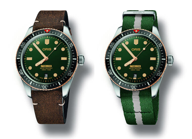 ▲Divers Sixty-Five潜水表配有绿色尼龙NATO表带以及棕色翻毛皮表带两种款式。