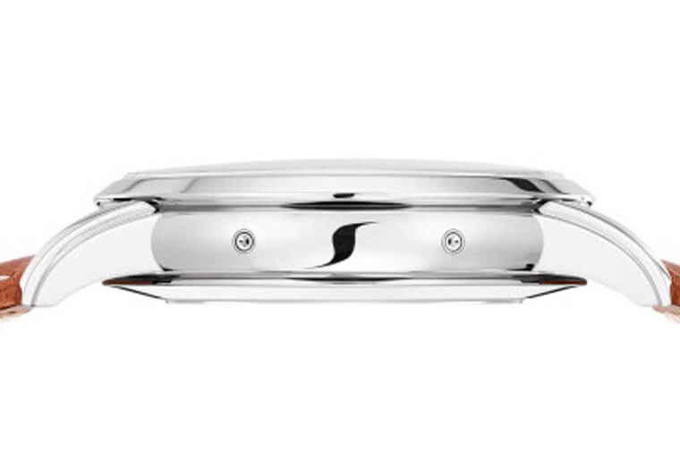 ▲表壳左侧设有两枚隐藏式按把,佩戴者可以据此分别快调星期以及周历显示。