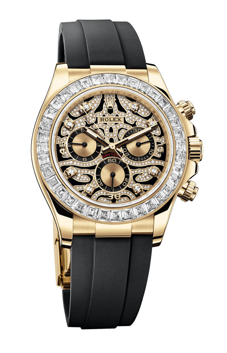 犹记得劳力士在2018年推出的Oyster Perpetual Cosmograph Daytona18ct永恒玫瑰金款,外圈饰以彩虹渐变色蓝宝石,而2019年,这款着名赛车计时表表现了更加名贵神秘的的崭新面貌——蚝式恒动宇宙计型迪通拿18ct黄金款。外圈上用36 颗梯形钻石代替经典的测速计。在密镶钻石的黑色漆面表面上,香檳色计时盘、黑漆与钻石相互交织,一举手就是熠熠生辉。