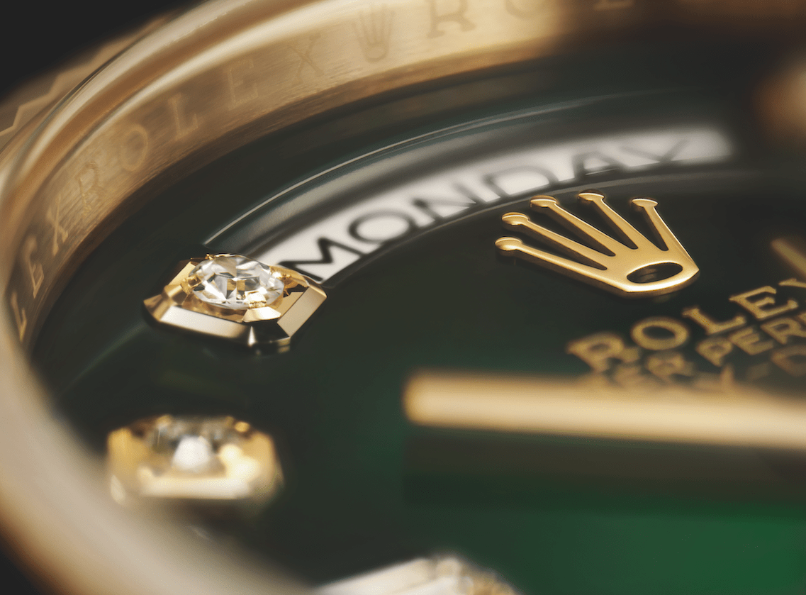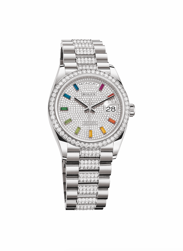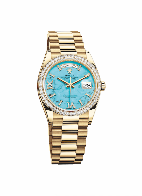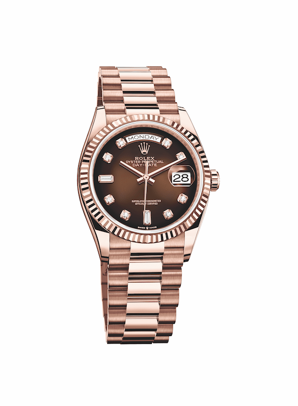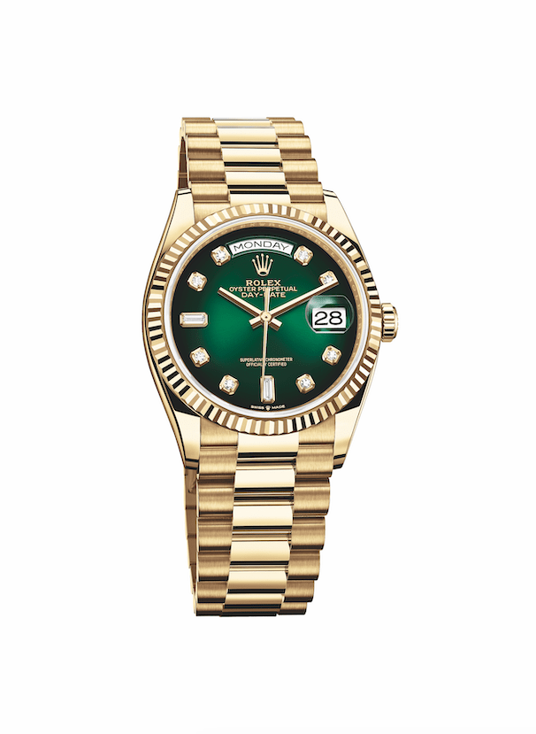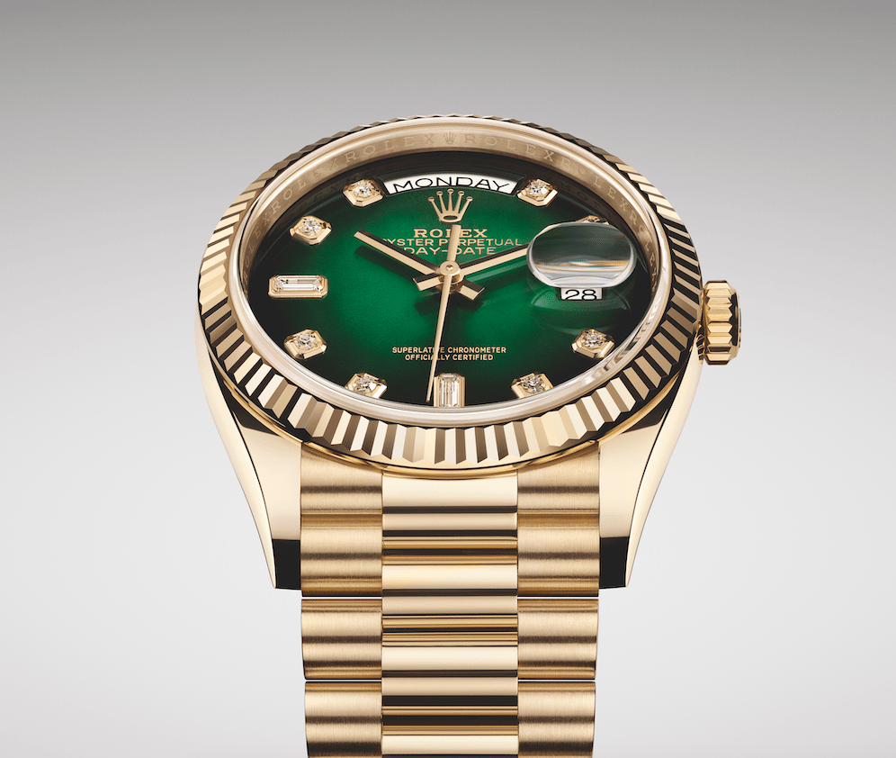 劳力士一次推出了五款全新Oyster Perpetual Day-Date 36, 主要为黄金款、白色黄金款及永恒玫瑰金款,但均搭配独特新表面,且部分新款搭配镶钻外圈。其中两款分别搭配崭新设计的同心渐变色表面:一款为黄金款搭配渐变绿色面盘,另一款为玫瑰金款搭配渐变棕色面盘。两者皆缀以18ct金镶钻钟点标记,6点钟及9点钟位置镶嵌2颗方形钻石,此乃Day-Date 系列特有设计。