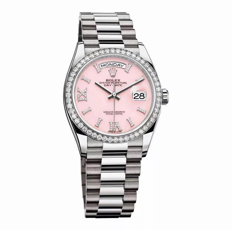 1956 年ROLEX劳力士推出的Day-Date开创先河,是全球首款在 12 点钟位置的弧形窗内显示星期全写的日期腕表,堪为当年的一大技术成就。世界各地众多政界要人、总裁及高瞻远瞩之士均曾佩戴 Day-Date。 此款腕表极具知名度,尤其是它的标志元首型表带,更是彰显腕表至尊风采。而在2019年劳力士推出了新款的Day-Date,延续这款传奇腕表的故事。