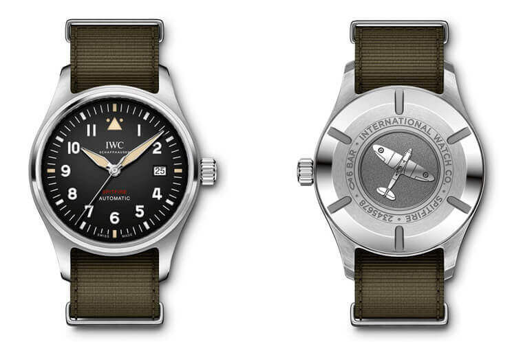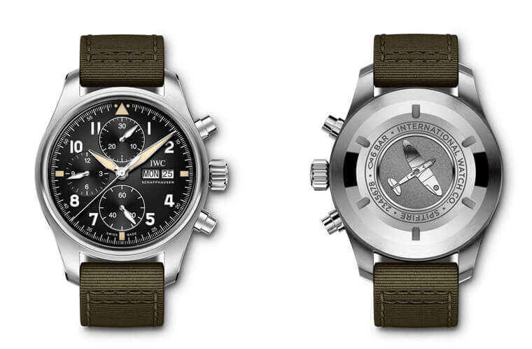 不锈钢材质的喷火战机系列尚推出一款IW387901的计时码表,没错,它与青铜款同样搭载系列首见的69000系机芯,在黑色面盘上6点方向为小秒盘、9点方向为计时盘、12点方向为计分盘,IWC另在3点方向设置日期、星期窗,让视觉感受更为平衡,同时包括前面四个表盘/视窗方位的时标以及时、分指针乃是涂上米黄色的夜光物料,配合绿色织物表带自然而然有一种怀旧军表的况味;类似的设计则出现在系列中另一款不锈钢基本款——IW326801,它与青铜款的IW326802同样搭载32110机芯,不锈钢新款除了指针造型和6点方向多了红色的”SPITFIRE”字样,整体上看来彷彿就像是马克11重生般让人倍感眼熟,经典风格将会勾起飞行表迷的美好记忆。