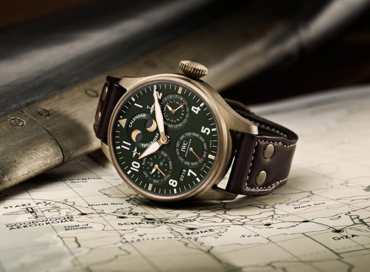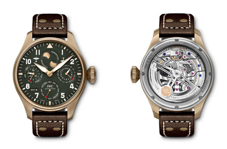 青铜系的喷火战机腕表以大型飞行员万年历腕表(号IW503601)为首,它是飞行员系列中少见达到万年历等级的复杂功能款式,面盘中排列了上下左右对称的四枚小表盘,从3、6、9、12点方向分别看起依序为日期/动力储存显示、月份显示、星期/小秒显示以及IWC特色的南北半球月相显示,配合7~8方向的四位数年份显示,清楚展示出结构设计精密的万年历机制,若佩戴者一直都有佩戴或让腕表维持运作,那麼从现在一直到2100年,表款的历法资讯都会是准确无误的;同样精准的还包括月相显示,IWC的月相转盘轮齿做得相对密致,也因此每隔577.5年,月相才会累积达一日的误差,这也等同于一种「万年月相」的概念了。