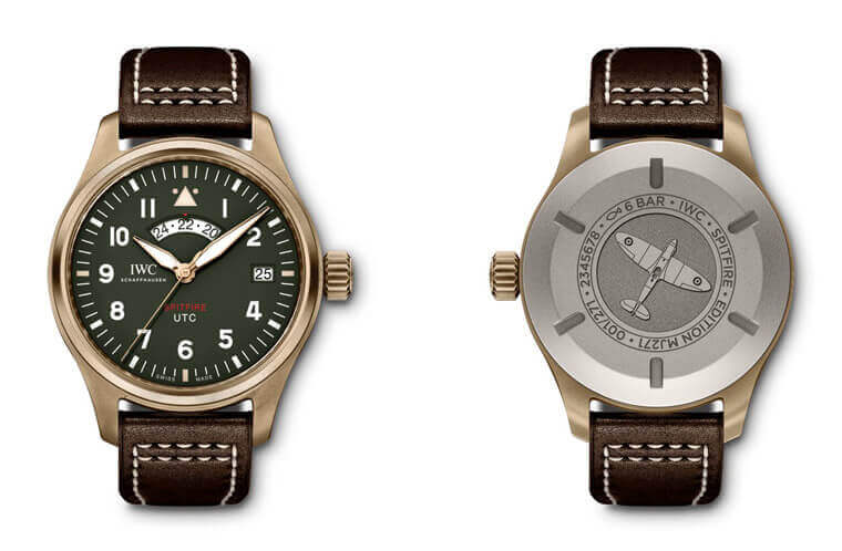 喷火战机系列的另一款青铜表为UTC环球时间飞行员腕表”MJ271”特别版(IW327101),所谓的MJ271指的正是「银焰掠空-最长的飞行」计画裡面的古董喷火战机,这个名称即为该架飞机的编号。这款表是IWC第一次把所谓的将世界协调时间(UTC)融入自制机芯的设计中,因此在表款的三针面盘上,会发现12点方向多了一个扇形视窗,此处并非日期显示(日期显示就位在3点位置),而是显示第二地时间的视窗,或许刚开始阅读会有点不适应,但只要清楚腕表的面盘设计后,看时间反而变得易如反掌。表款搭载的82710机芯不仅具有IWC着名的比勒顿上链系统,甚至还导入了陶瓷零件,使得机芯的耐用度向上提升。