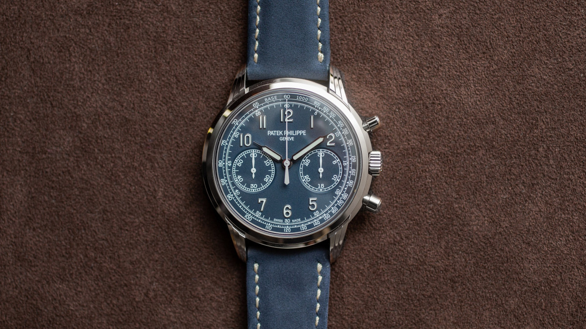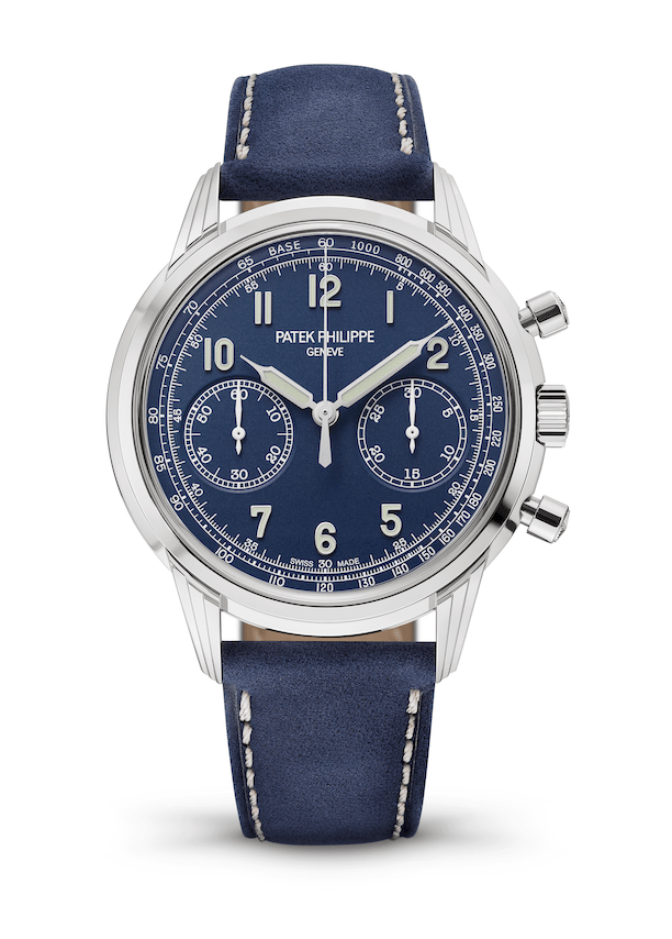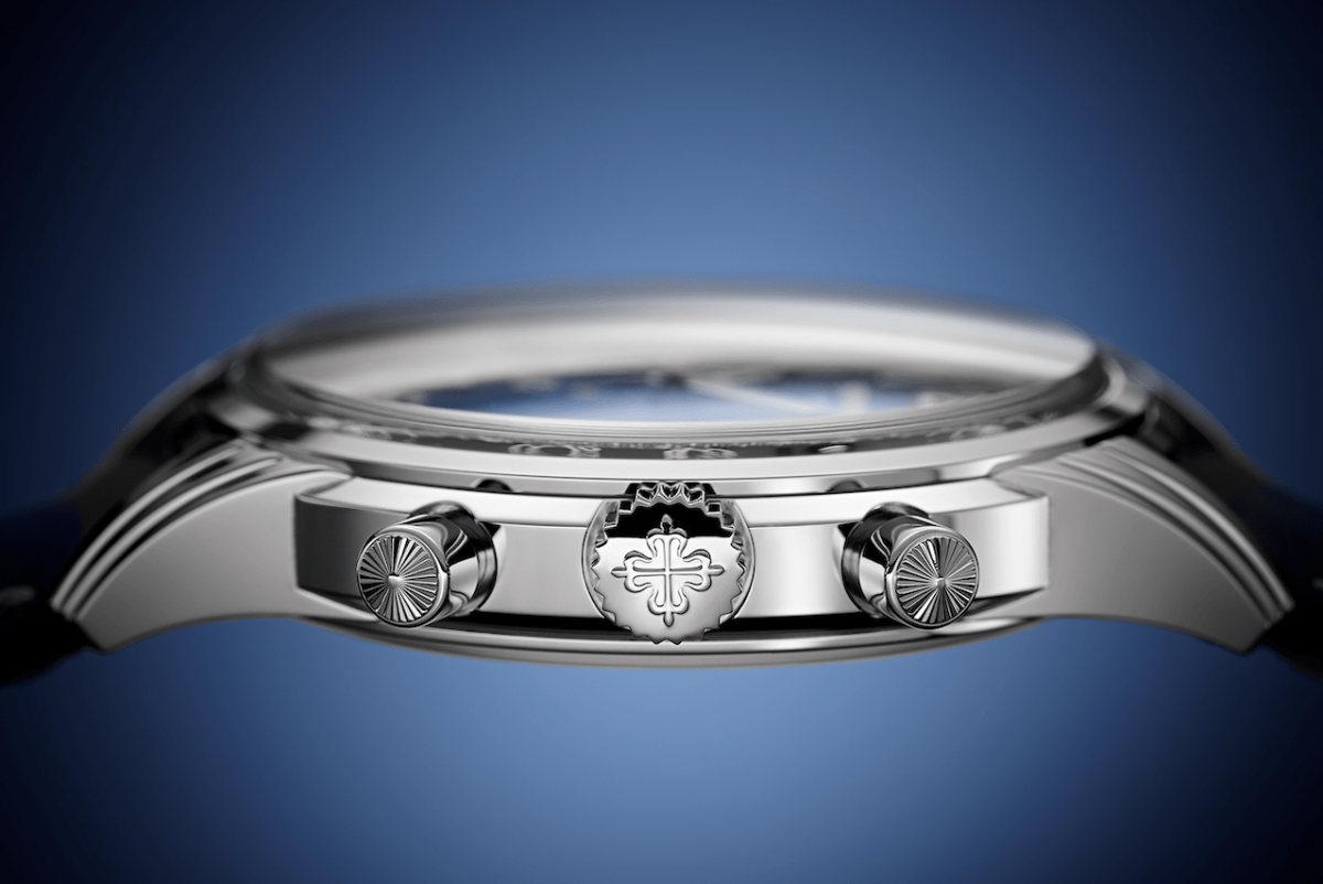 面盘设计也换然一新,蓝色背景映衬天上夜光涂层的白金阿拉伯数字对比鲜明,搭配巴顿式白金尖头时针和分针,且添上夜光涂层。中央计时秒针经喷砂处理,搭配白色转印分钟计算器连流速计刻度,以及搭配小三针连计时秒针装置30分钟计算器,外缘由轨道式分钟刻度环抱。面盘种种细节匠心独运,确保不论日夜光暗皆清晰可读。