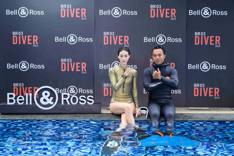 ▲台湾自由潜水好手卢宏洋抢先佩戴柏莱士2019全新上市的BR03-92 Diver Green Bronze,现场分享他对潜水的热爱以及优质潜水表在潜水过程中扮演的重要角色。