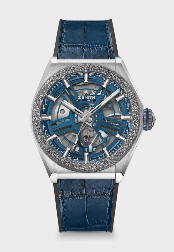 面盘上宽大的时针和分针扫过机械结构,而细长中置小秒针顶端则採用星形装饰,配备秒针停走系统,可实现超精确校准,精确到秒。 标志性的Defy Inventor採用蓝色鱷鱼皮内衬黑色橡胶表带,贴合在手腕上,具有极致的未来主义风格。