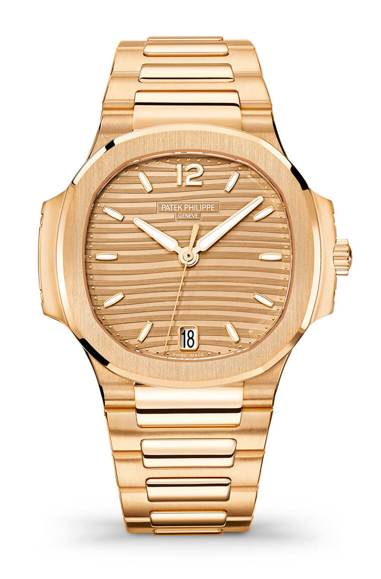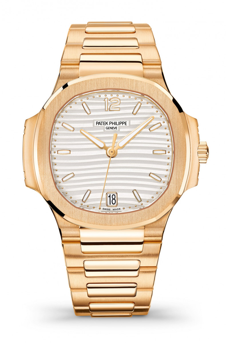 腕表採用1976年Nautilus 系列首个男式表款的知名设计,两个纤长的横向表耳模仿舷窗上的锁与铰链,搭配八边形表圈经过圆润处理且饰有倒角边缘。表圈和表壳顶部经过缎纹装饰,侧边採用镜面拋光处理,构成微妙的对比效果,突显结构的精巧。这次面盘有两种色彩可选:银调乳白色和金调乳白色。轻柔的波纹浮雕图案是Nautilus系列女式腕表的标志性特色,赋予腕表以出众的个性。立体字块以及时标和指针均採用覆萤光涂层的玫瑰金材质,确保清晰易读。玫瑰金立体边框令6时位置的日期视窗更加醒目。
