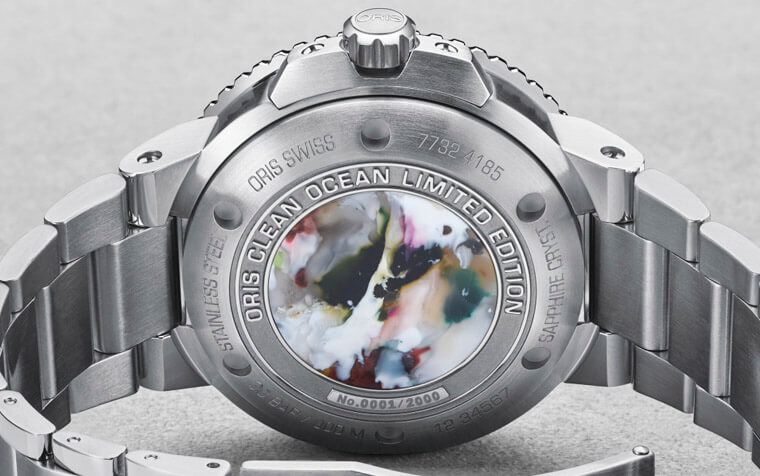 而洁净海洋限量腕表的表背也还有值得一看的地方,乍看它是实底盖设计,但你应该会觉得为什麼底盖上会有一种像是水彩任意涂鸦的图案,其实这裡的设计也是要呼应太平洋垃圾筛选组织,因为底盖上的图案实际上是以再生PET塑料制成的,让人有点意外原来海洋垃圾也能成为手表上的一种装饰,而ORIS通常这类型的联名表都会做限量,这款也不例外,限量2000只的编号就位在表背9点方向。