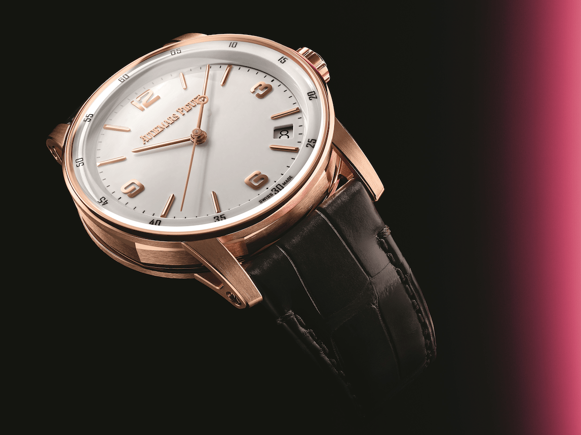 ▲CODE 11.59系列自动上链计时码表,玫瑰金表壳巧妙呼应面盘上的弧形拋光金质时标、12点钟位置的单一数字、立体的爱彼商标与修长的棒形指针。