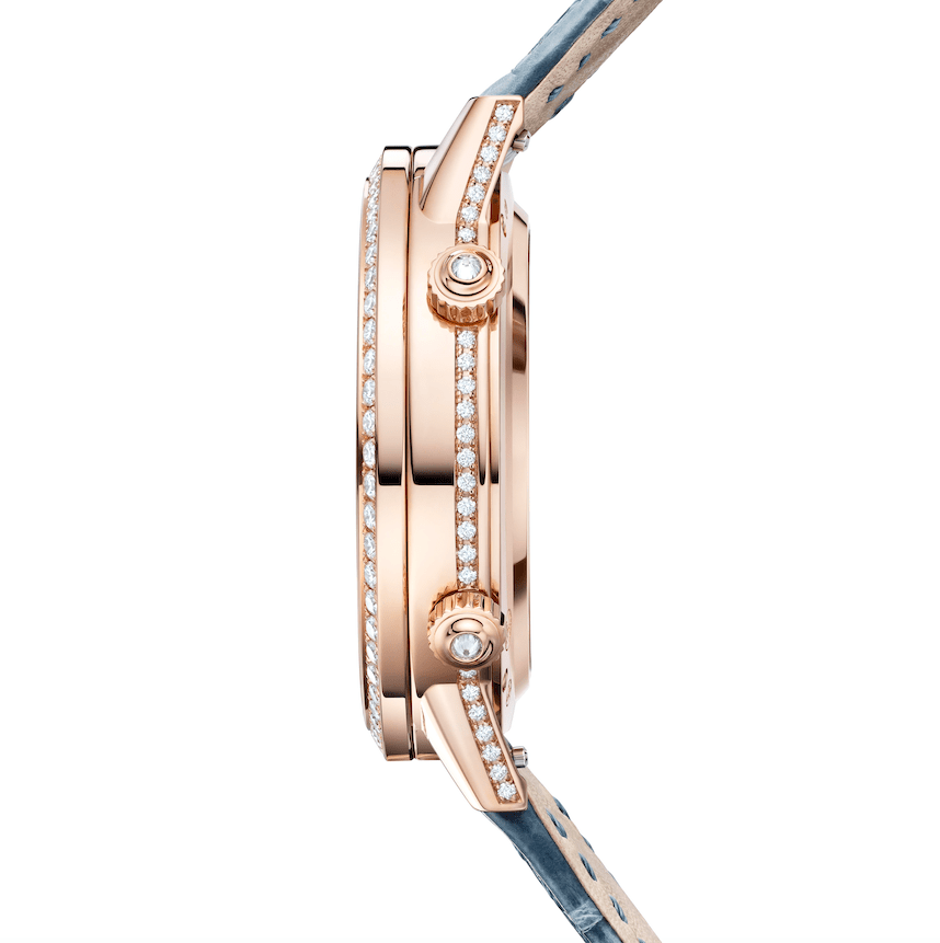 ▲此次腕表採用淡蓝色面盘搭配玫瑰金表壳,让腕表更增添一份女性魅力。