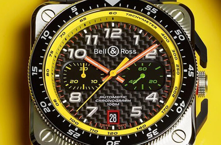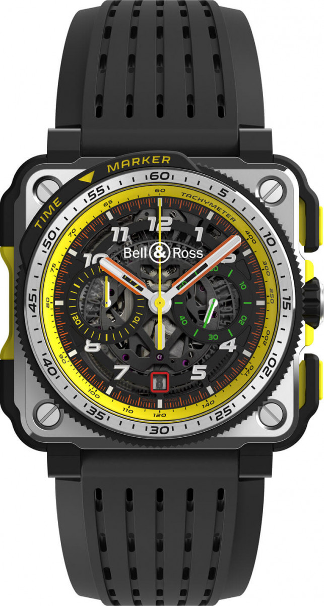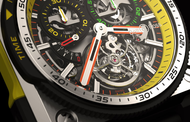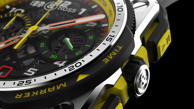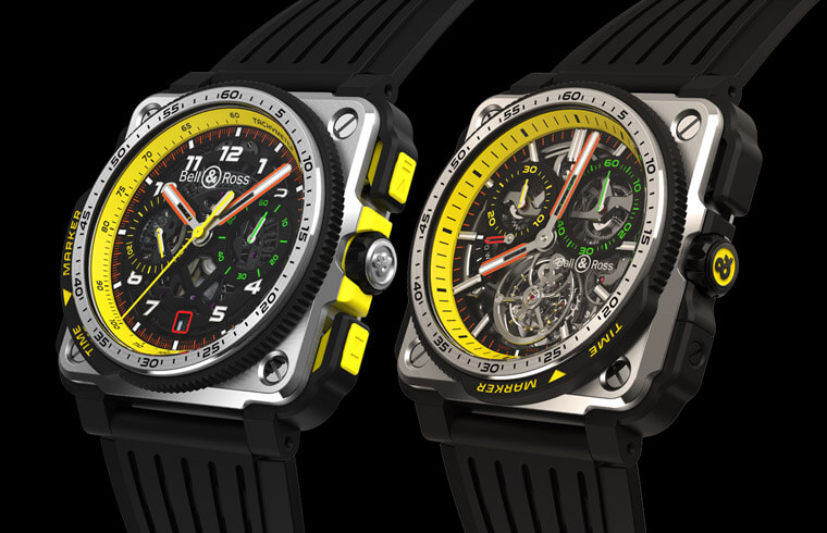 而2019年新款的BR-X1 R.S.19除了超有特色的按把设计不变之外,柏莱士还替它载表圈外部加上了一个所谓的「时间标记」功能,佩戴者可以利用上面的黄色箭头指示秒针停止的位置,这对赛车手要连续标记不同的时刻有所帮助,而这款交互搭配5级钛金属、陶瓷及橡胶材质,加上透视面盘设计,这款表的重量因此相当轻,不会让赛车手感到负担沉重。至于系列功能最高阶的BR-X1陀飞轮计时码表R.S.19则是延续BR-X1的精简风格,它的表圈同样设时间标记,并配备停秒功能,表款的亮点——陀飞轮位于面盘6点方向,每分钟360度旋转的擒纵装置使整个机械装置能抵抗地心引力的影响,进而提升计时精准度,对于重视分分秒秒的赛车手而言,这种准确性弥足珍贵。