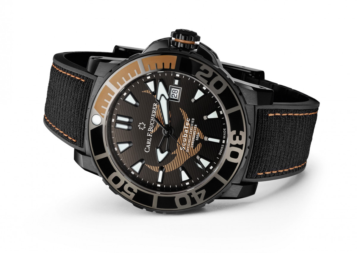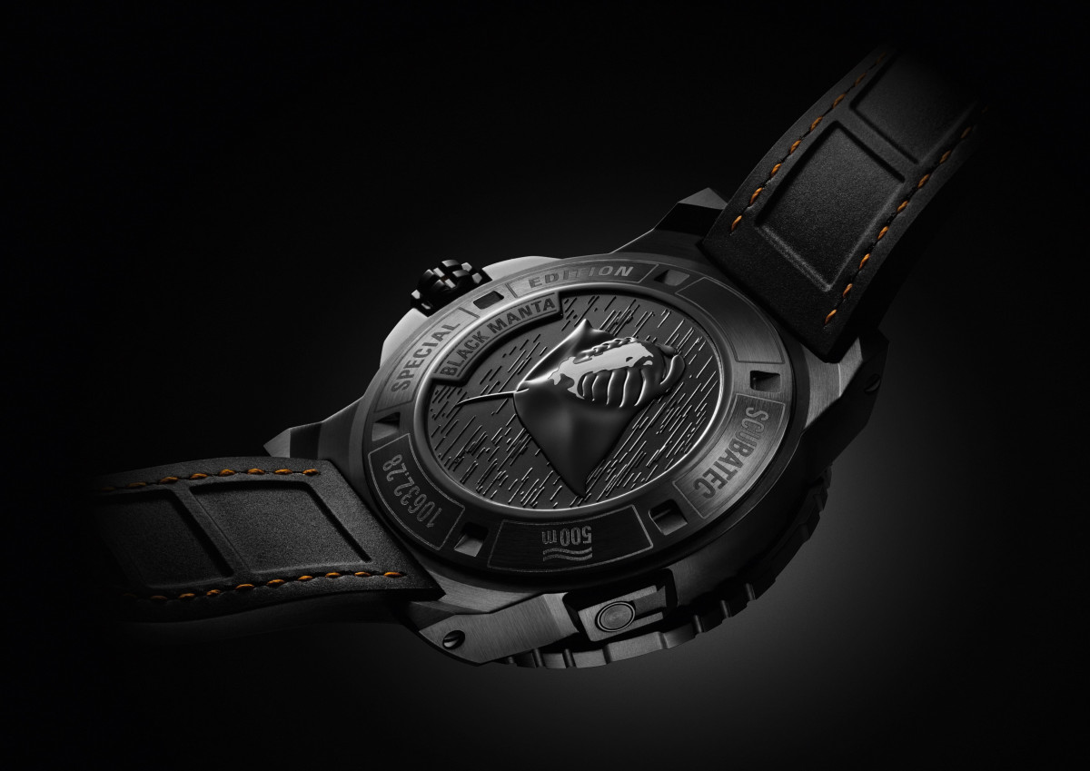 此次腕表以轻巧钛金属制作是此系列的新尝试,表壳经黑色类钻碳涂层处理,深黑色调与象徵古老潜水器械的青铜色调形成对比。黑色面盘中央饰有两条魔鬼鱼的图案轮廓,时标及指针经Super-LumiNova夜光物料处理,钛金属及陶瓷单向旋转表圈让佩戴者可设定水底下潜泳时间。
