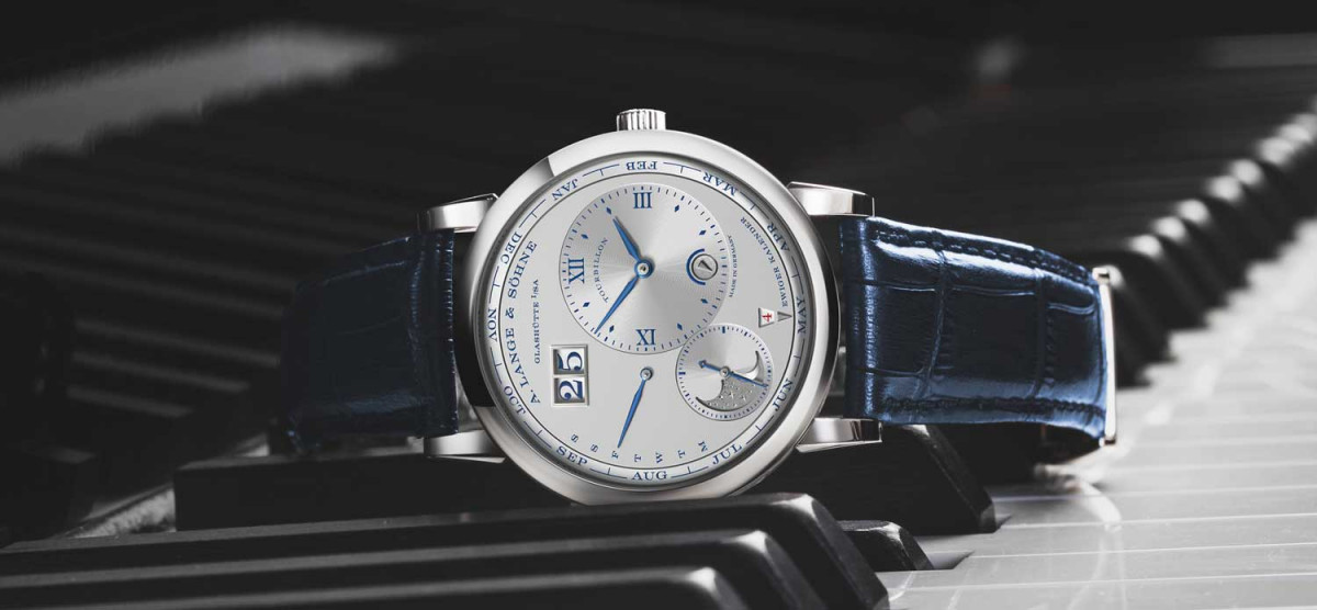 此款腕表与2012年推出的 Lange 1 Tourbillon Perpetual Calendar採用了相同的排列方式。用以指示月份的旋转外圈,使各个日历显示得以在LANGE 1 的面盘结构中融为一体。 25th Anniversary特别版的银白色面盘流露蓝色细节。此色调在热蓝钢指针和各刻字中完美演绎,更包含在大日历显示的数字和鱷鱼皮革表带上。