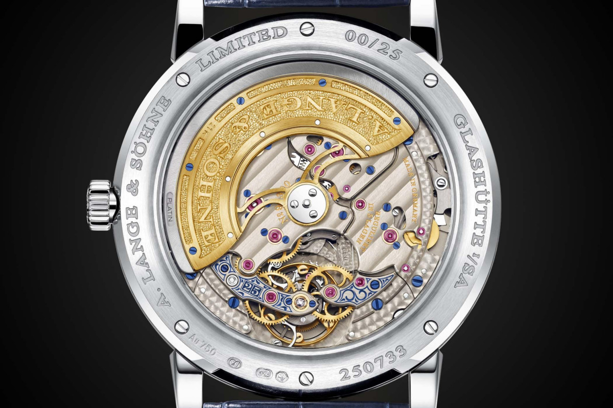 陀飞轮夹板鐫刻蓝色朗格大日期显示造型,编号为 25。「25」不仅让人想起周年纪念,也代表着腕表面世当日的一项特别细节。