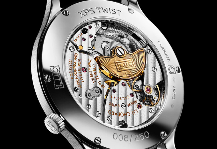 腕表搭载的96.26-L机芯,是96.01-L机芯偏移30度的变奏款。与原型机芯一样,其厚度仅3.3毫米,从而得以大幅减少此全新时计的表壳厚度。机芯通过22K金雕刻的微型自动盘上链,微型自动盘的强大惯性优化了上链效能。96.26-L机芯驱动依靠萧邦专利Twin架构铺排的两个叠置发条盒。得益于上述机械装置,机芯具备65小时动力储存,对超薄腕表而言可谓非凡创举,同时可达到符合精密计时认证的精准度。