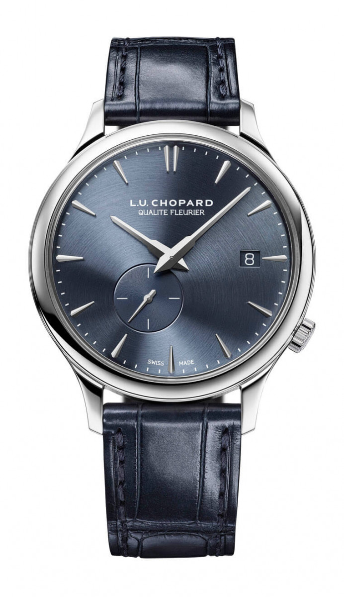 腕表面盘纹理以12时位置的L.U.Chopard标志为中心,表冠和小秒盘採用偏心设计,妙趣盎然,同时秉承L.U.C系列一贯的品质基准。环形缎纹自小秒盘向外层层曾发散,覆盖整个蓝灰色面盘,进一步增强了视觉吸引力。另一不同常规的设计,在于这款腕表是L.U.C系列唯一未在12时位置採用阿拉伯数字的表款,而藉由双重刻面时标指示 「12点 」。