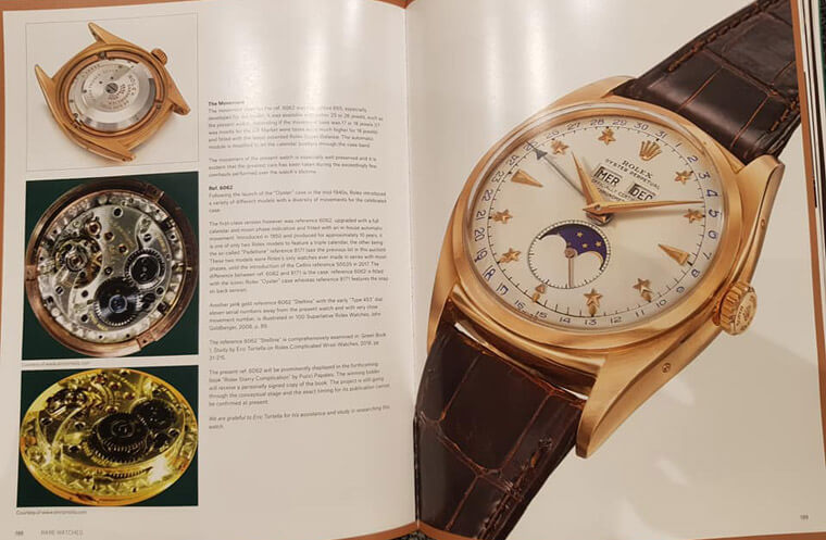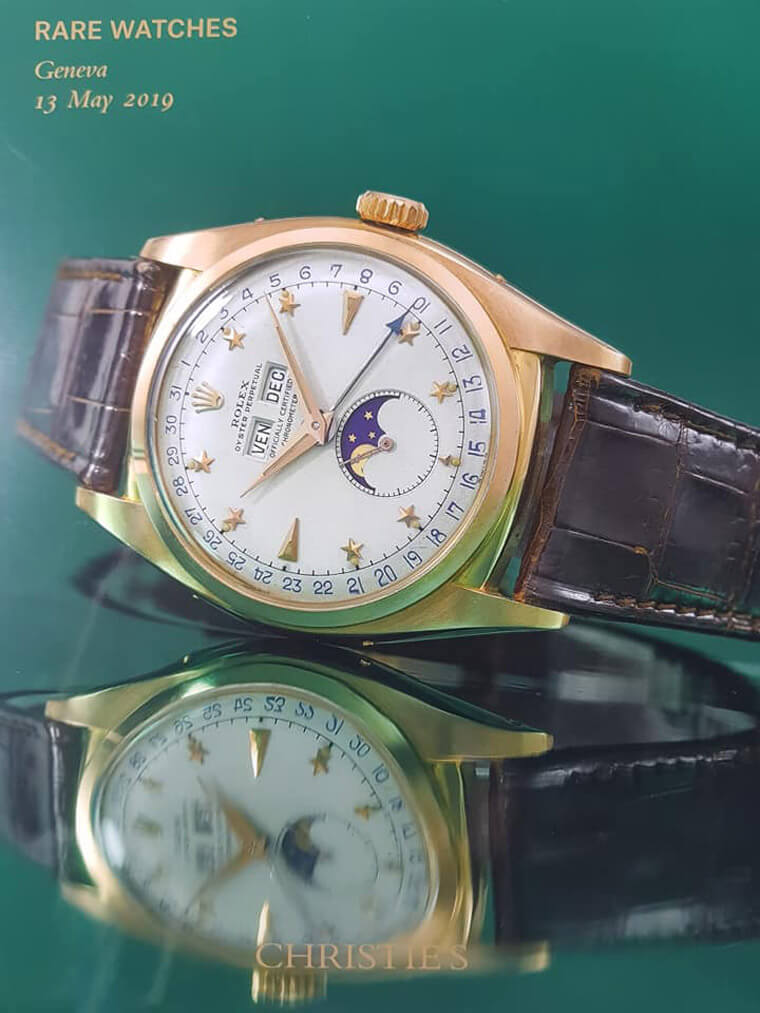 Roger举两个例子,首先是劳力士1950年代制作的一款全日历月相表(编号6062),看起来小有特色但就是经典正装表的设计,它竟然被放到了这次佳士得拍卖会的封面位置,至于预估成交价呢?瑞郎1百万~2百万,如果瑞郎看起来没有太惊讶的感受,那换算成台币的话,它的预估成交价最高可能会冲高到台币六千万!花六千万买一只劳力士,这应该超出多数人的想像了。