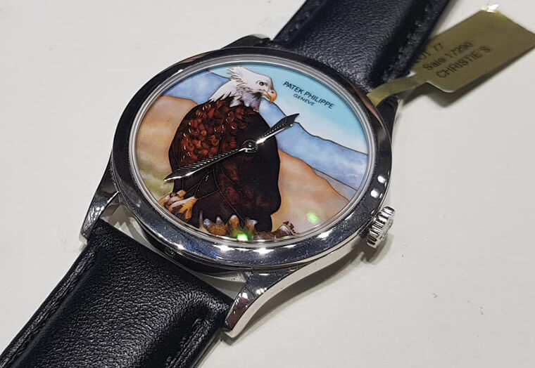 ▲PP 5077美国鹰珐琅彩绘铂金表,以掐丝与微绘技法,由当代珐琅大师Anita Porchet纯手工绘制,2010年制。