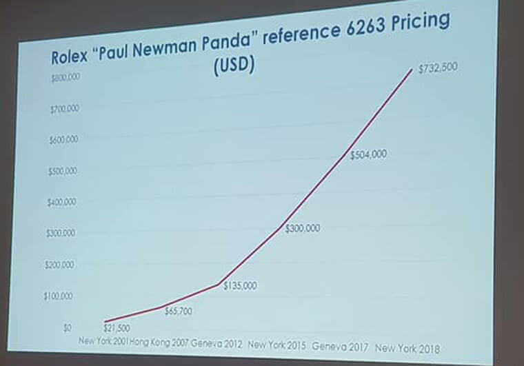 ▲从这张图可以发现古董手上链Daytona从2001年的拍卖价USD 21,500到2018年成交价USD 732,500,涨幅惊人,是最佳投资标的。