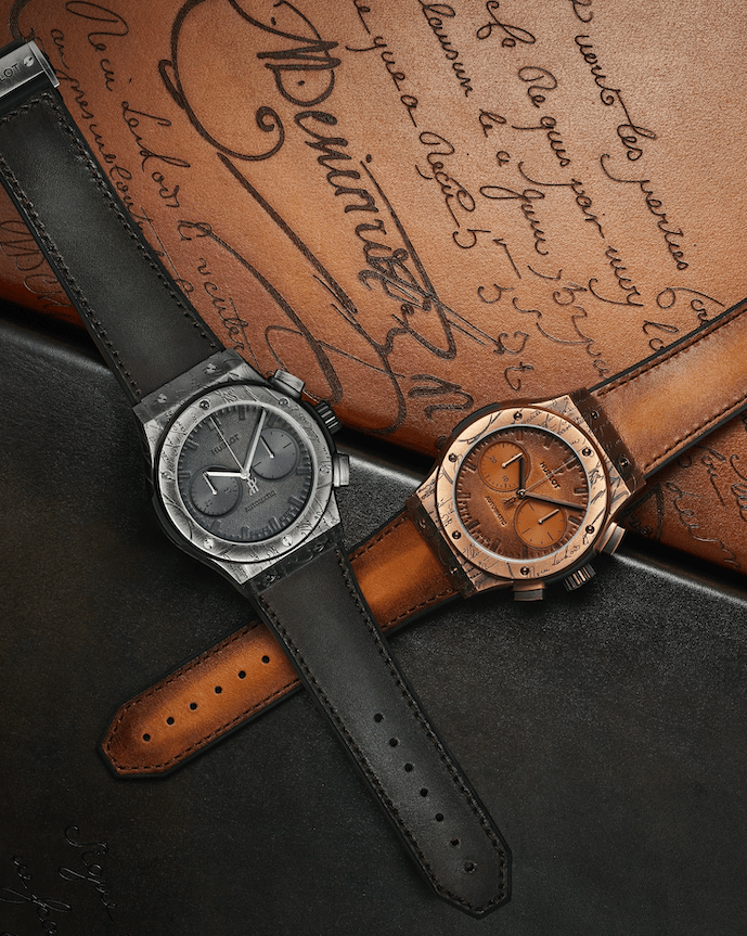 ▲宇舶2019年延续与BERLUTI的合作,推出全新经典融合系列Berluti计时码表,金属面盘搭配仿旧渐层皮革表带质感依旧,高雅品味让人无法抗拒。