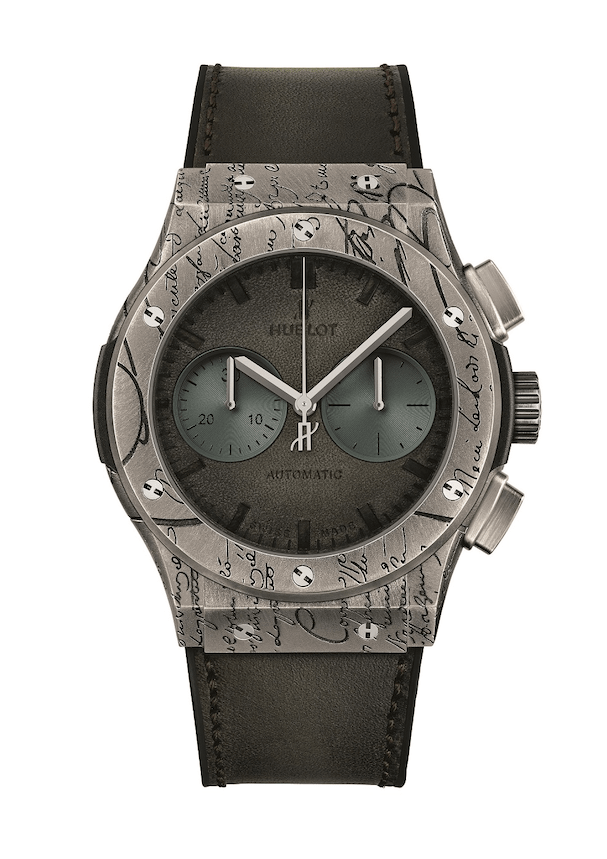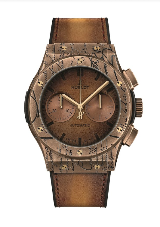 此次Berluti计时码表共有钛金属与青铜两种款式,将BERLUTI最经典Scritto符码精雕于表壳上,并且採用威尼斯冷棕色或冷金色皮仿旧渐层皮革表带,搭载计时码表功能,复古优雅却带有活力的时尚感,再次展现宇舶独树一格的当代制表理念。