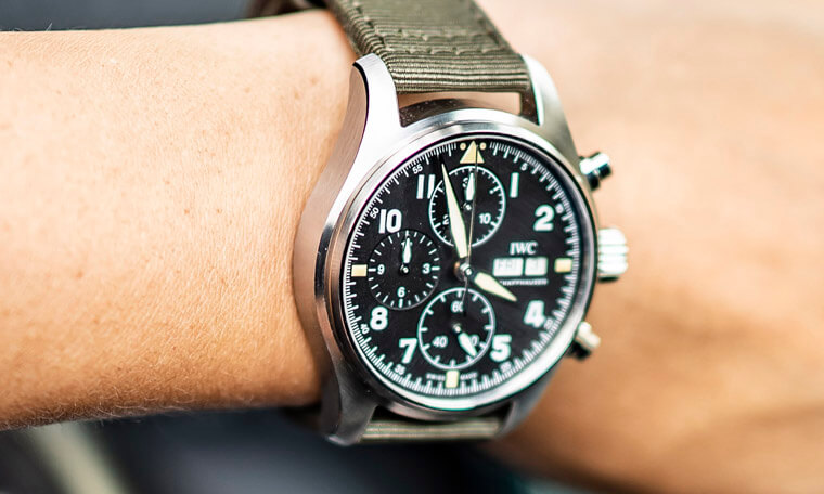 ▲喷火战机飞行员计时码表以不锈钢表壳,搭配绿色织物表带自然而然有一种怀旧军表的况味。