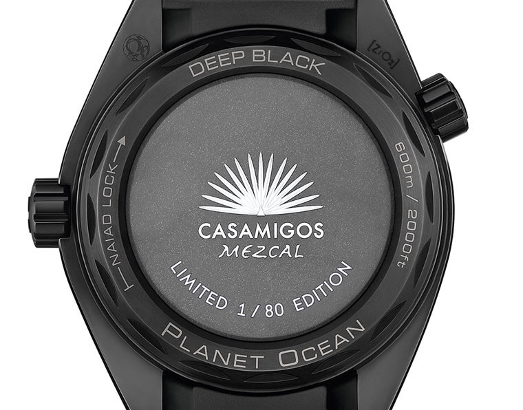 OMEGA欧米茄在2019年与快速成长的烈酒公司Casamigos Tequila and Mezcal合作,隆重为美国顾客献上一款全新Planet Ocean「Deep Black」Casamigos腕表。Casamigos Tequila and Mezcal是由乔治.克隆尼、蓝迪.盖柏与麦可.梅德曼共同创办的,而三者也都跟欧米茄有着紧密的合作关系,也以此合作腕表纪念品牌与三者紧密与长久的友谊。