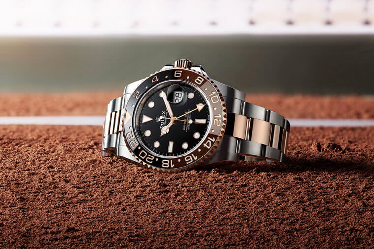 ▲劳力士在法网期间主打的款式为GMT-Master II,2018年品牌推出的棕黑双色圈加上半金材质,和红土球场一拍即合。