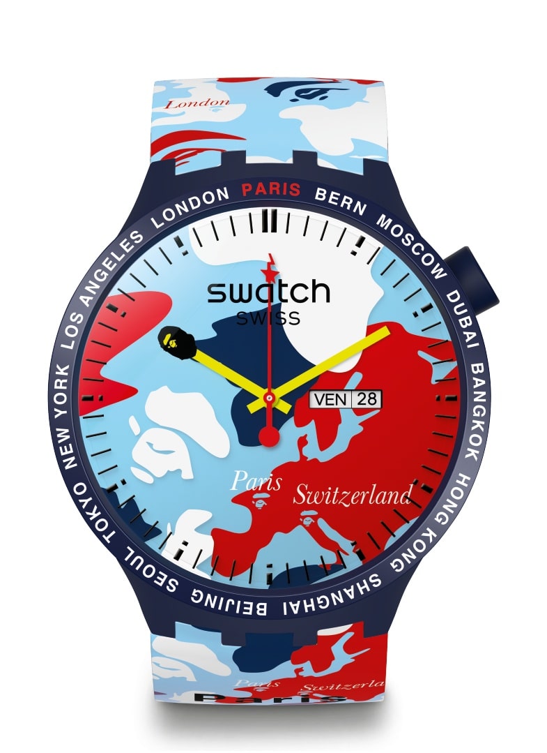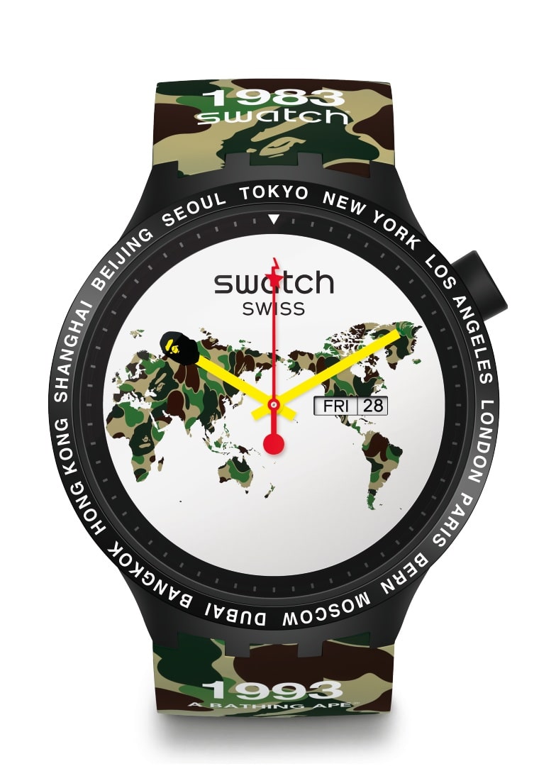 六款腕表均绘制有BAPE®全新设计的招牌迷彩图案,时针和下表带均饰有BAPE®的猿人头品牌标志,而醒目加粗的SWATCH标志则让人联想起SWATCH于1980年代的首次震撼亮相。其中五款手表以城市伯恩、伦敦、纽约、巴黎、东京为主题,带有独立编号,限量发售983只(伯恩版)或1993只,以此纪念两个品牌各自的诞生年份,而第六款Big Bold BAPE The World 则以世界为主题,向全球致敬。