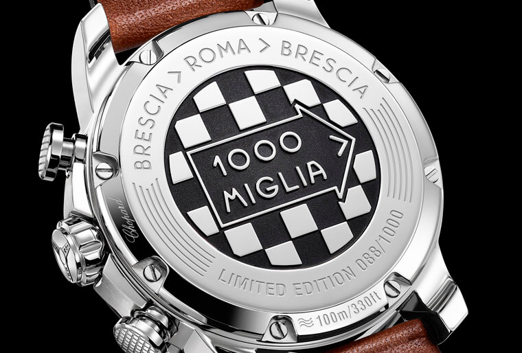 有别于2018年Mille Miglia腕表採用透明底盖,Mille Miglia 2019 Race Edition改成实底盖设计,以螺丝固定底盖确保其防水性能达到100米的水准(去年版本的防水性为50米),实底盖虽然无法欣赏到机芯的作工与擒纵系统的走时动感,但萧邦也毫不含糊地在上面刻印了经过黑色PVD处理的Mille Miglia车赛标志(形成类似方格旗的效果),底盖上缘註明Brescia>Roma>Brescia的比赛路径,另外下缘则有每只表的限量编号,提醒佩戴者每款Mille Miglia腕表都是独一无二的存在。至于表款搭载的自动机芯能够精准测量至1/8秒、机芯震频为4Hz,动力储存48小时,走时水准是通过C.O.S.C.认证的-4~+6水准,分秒必争的精准度,也象徵了腕表与古董车赛追求速度的共通点。