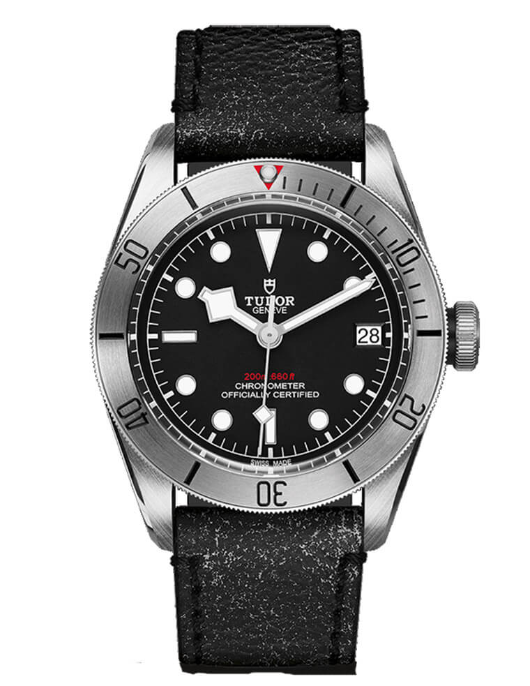 帝舵的Black Bay系列自从2012年复古再现之后,竟一路壮大到成为品牌现在最畅销的人气系列,尤其自从2016年品牌开始把自制机芯导入到Black Bay系列后,对于拉抬这系列的声势和好评又有决定性的效果。现在Black Bay系列已经衍生出很丰富的系列成员,有基本款,也有青铜壳、黑色PVD壳、半金,甚至是两地时间和计时码表款式。这款Black Bay Steel是2017年推出的,顾名思义它的表圈和表壳清一色都是以不锈钢材质制成。Black Bay家族外型讨喜的部分在于它融合了品牌早期潜水表作品不同时期的特色,例如雪花指针、方便佩戴者戴着手套也容易操作的大表冠设计,再来包括前15分钟的计时刻度和表圈12点方向的红色倒三角形指标等,都可以让人联想到出自那些原创表款的元素。