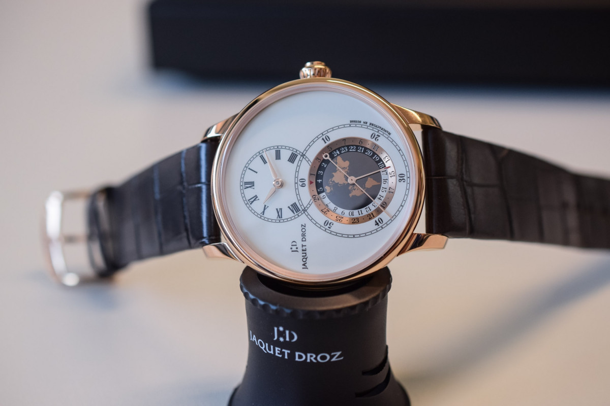 ▲两地时间与日期显示是旅行表不变的必备要素。雅克德将技术性要素与大秒针恪守不渝的美学特质巧妙结合,打造出全新两地时间手表。